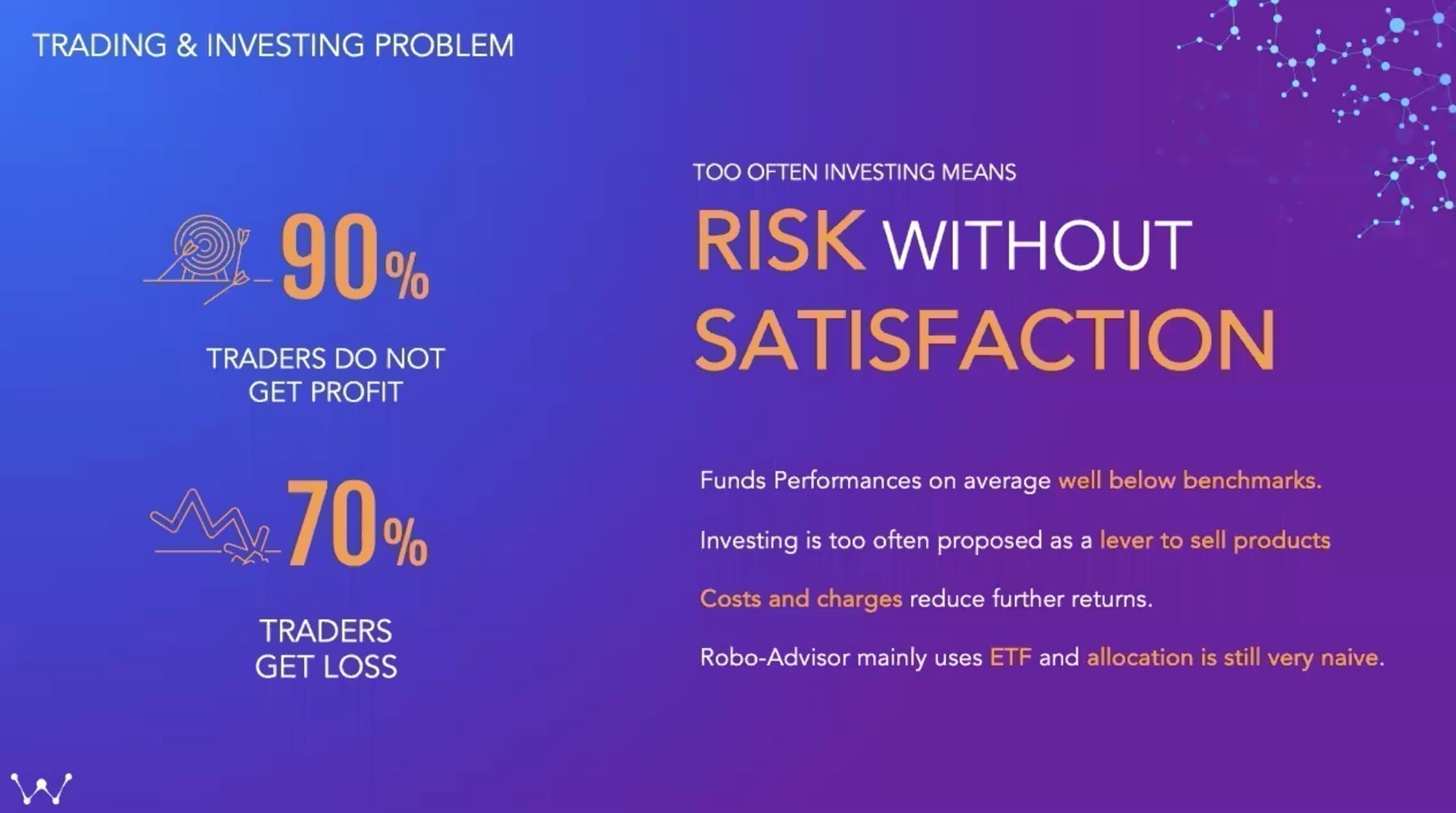 Provenendo dal settore finanziario siamo partiti da un dato, anzi due. Il 90% degli investitori fai da te non riesce a ottenere profitti dal proprio investimento e anzi, di questi il 70% brucia proprio il capitale investito, è quello che definiamo come tasso di mortalità degli investitori.