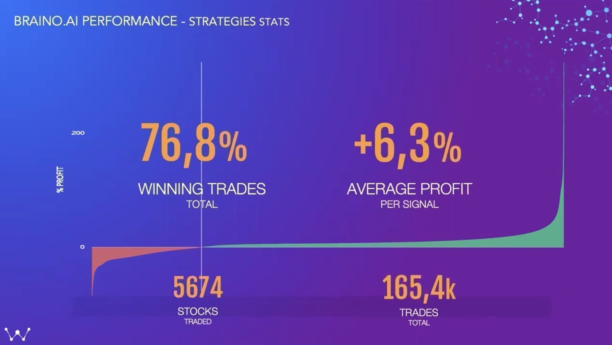 Pensate che nell’ultimo trimestre, su 5674 società quotate, Braino ha deciso ben 165.400 operazioni con tassi di successo davvero interessanti. Le operazioni profittevoli sono state il 76,8% del totale effettuato con un profitto medio per operazione del 6,3%.