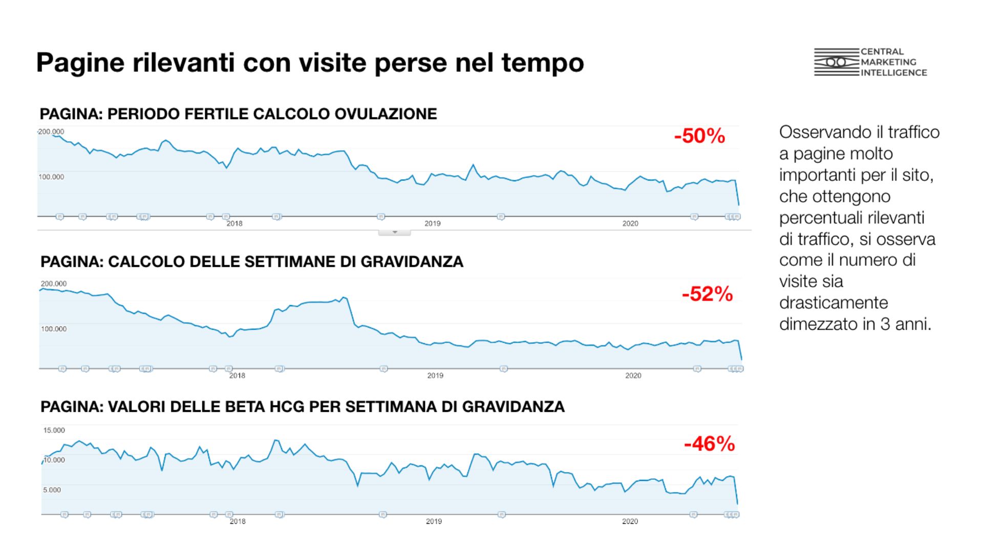 • Abbiamo impostato lo studio su Google Analytics, confrontando innanzitutto il quadro del brand con quello della concorrenza per capire se la riduzione delle visite fosse un fenomeno generalizzato. In effetti, abbiamo constatato che tutti i siti operanti in questo settore stavano subendo un calo persistente e fisiologico, dovuto alla diminuzione delle nascite.