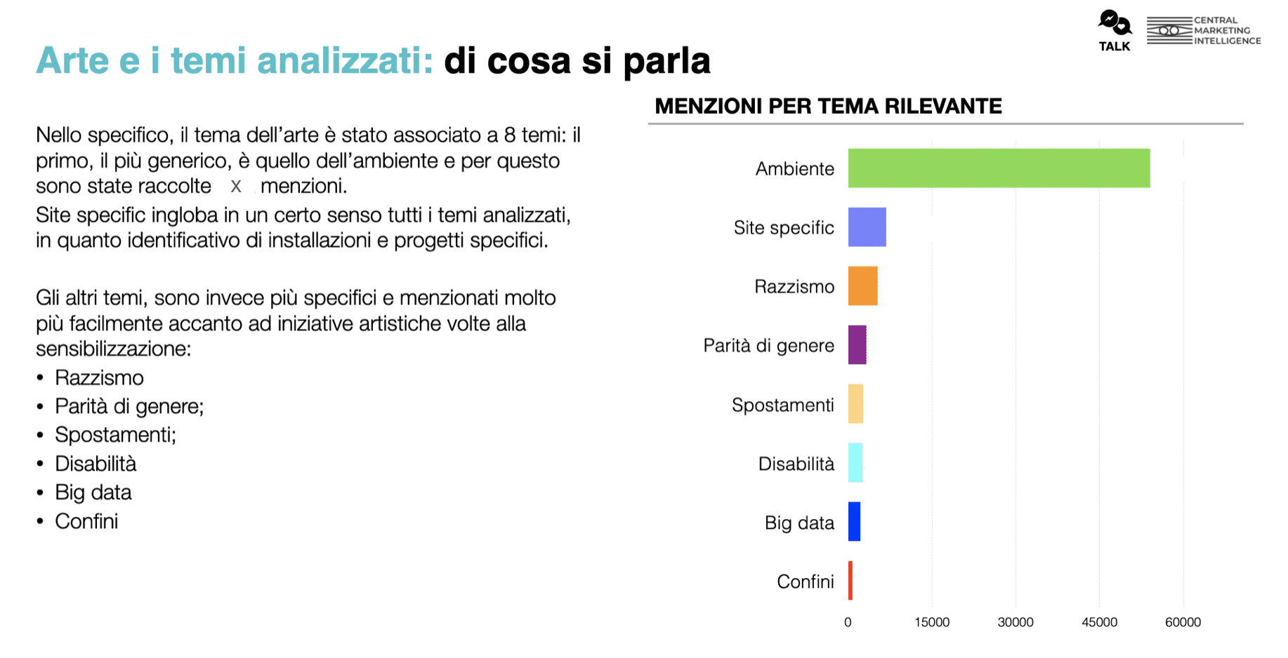 Successivamente, abbiamo studiato i vari temi in relazione all’arte, attraverso l’ascolto della rete. In questo modo è stato possibile comprendere quanto ed in che modo le tematiche sociali siano relazionate all’arte, in tutte le sue sfaccettature. Inoltre, è stato possibile comprendere il sentiment degli utenti, i temi più apprezzati ed utilizzati quando si tratta di installazioni artistiche.