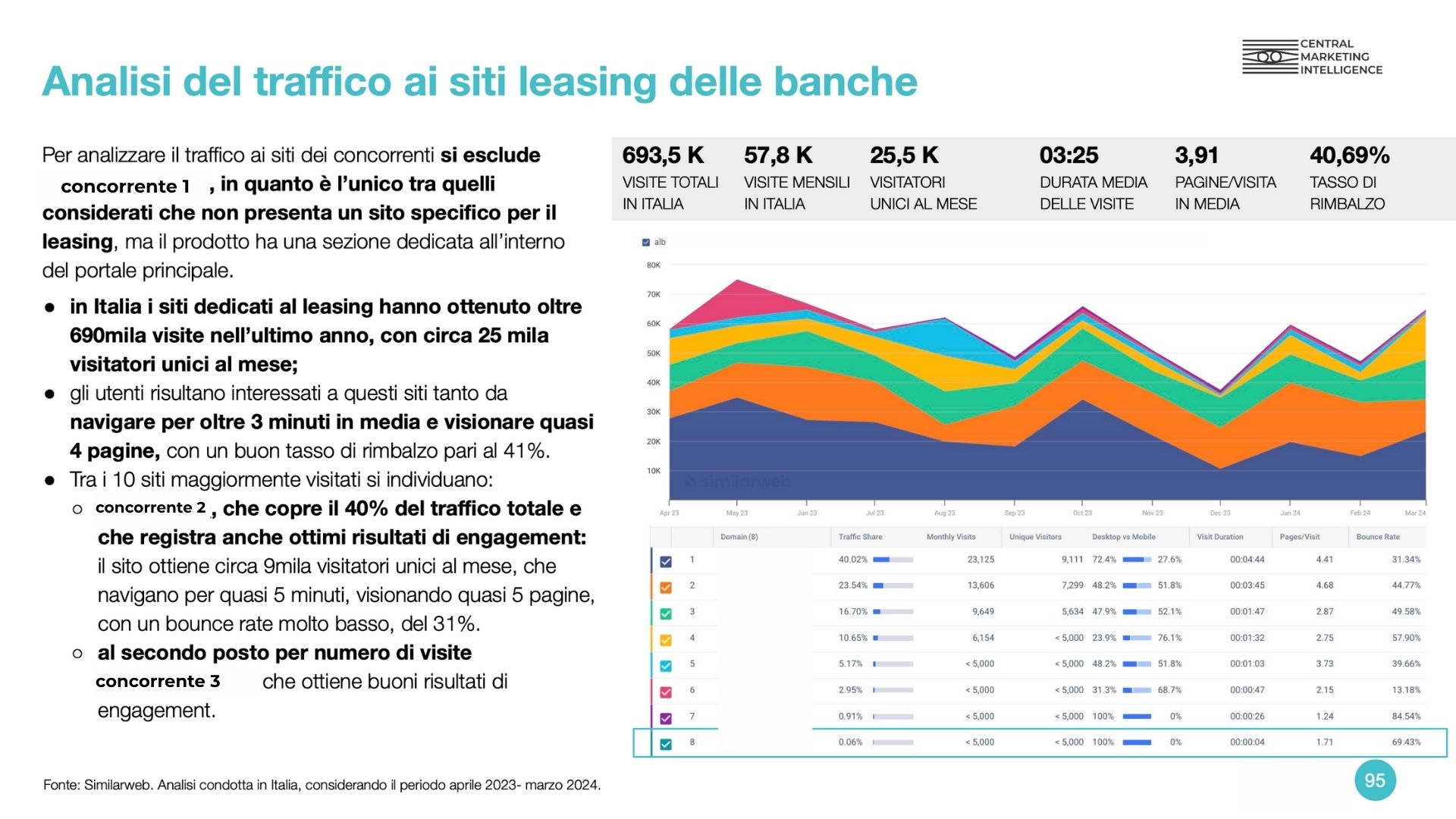 - Mappatura delle altre società di leasing e servizi finanziari, nazionali ed europei. Abbiamo analizzato i principali player del settore, approfondendo le loro offerte e le loro modalità di comunicazione online. Ci siamo soffermati sul confronto delle diverse variabili e condizioni che offrono all’interno dei contratti di leasing. Questo ci ha permesso di identificare delle aree differenzianti nell’offerta e nella comunicazione ancora poco presidiate dai concorrenti e che risultano quindi un’ottima opportunità per l’azienda cliente.