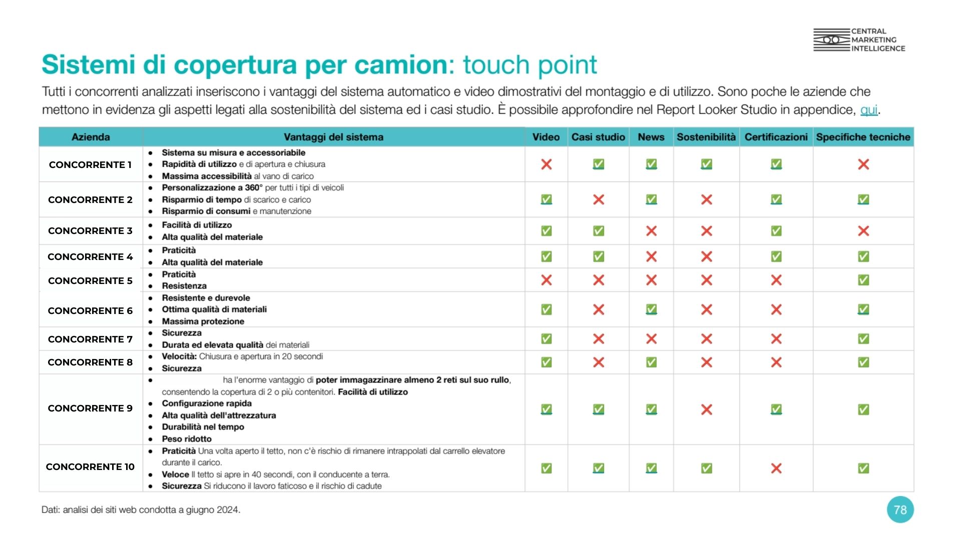 Infine, è stato realizzato un benchmark delle soluzioni oggi disponibili sul mercato: abbiamo analizzato le tipologie di teloni meccanizzati, le caratteristiche comunicate, le promesse commerciali e gli spazi di differenziazione non ancora presidiati.