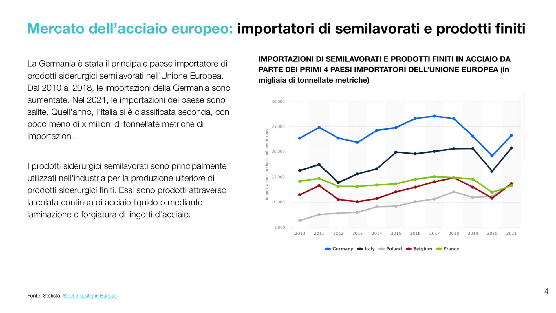 - analizzato il settore dell’acciaio focalizzandoci sui valori di import ed export dei metalli nell’eurozona. Abbiamo quindi dentificato le tendenze economiche ed i flussi commerciali principali che influenzano il settore nelle varie aree e ne abbiamo approfondito le dinamiche ed eventuali normative.