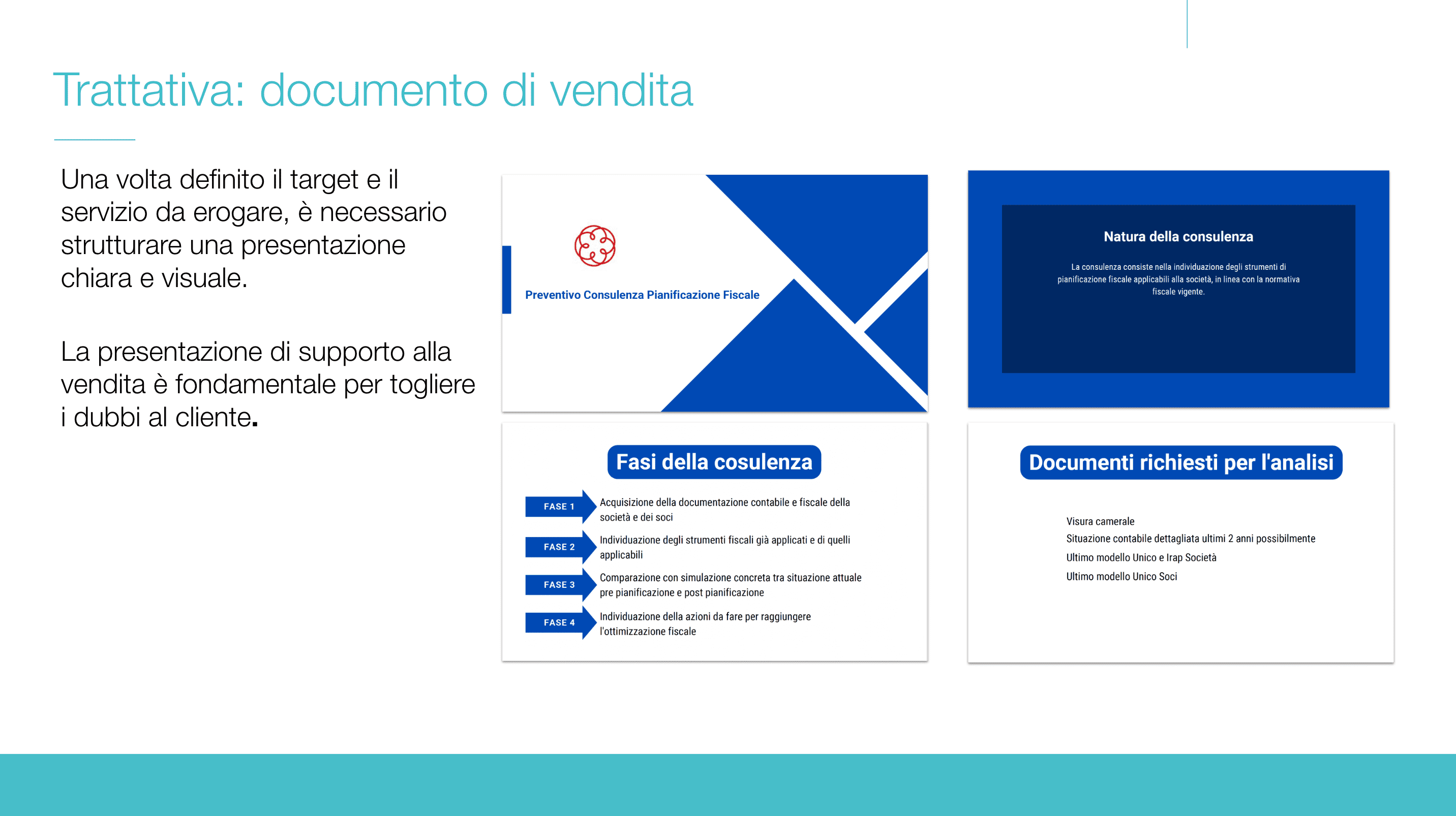 - Successivamente siamo passati ad esaminare il processo di vendita del commercialista. Abbiamo quindi dapprima identificato i punti di debolezza nell’approccio commerciale, comprendendo le modalità di gestione delle chiamate e suggerendo nuovi metodi più efficaci per arrivare alla chiusura della trattativa.
