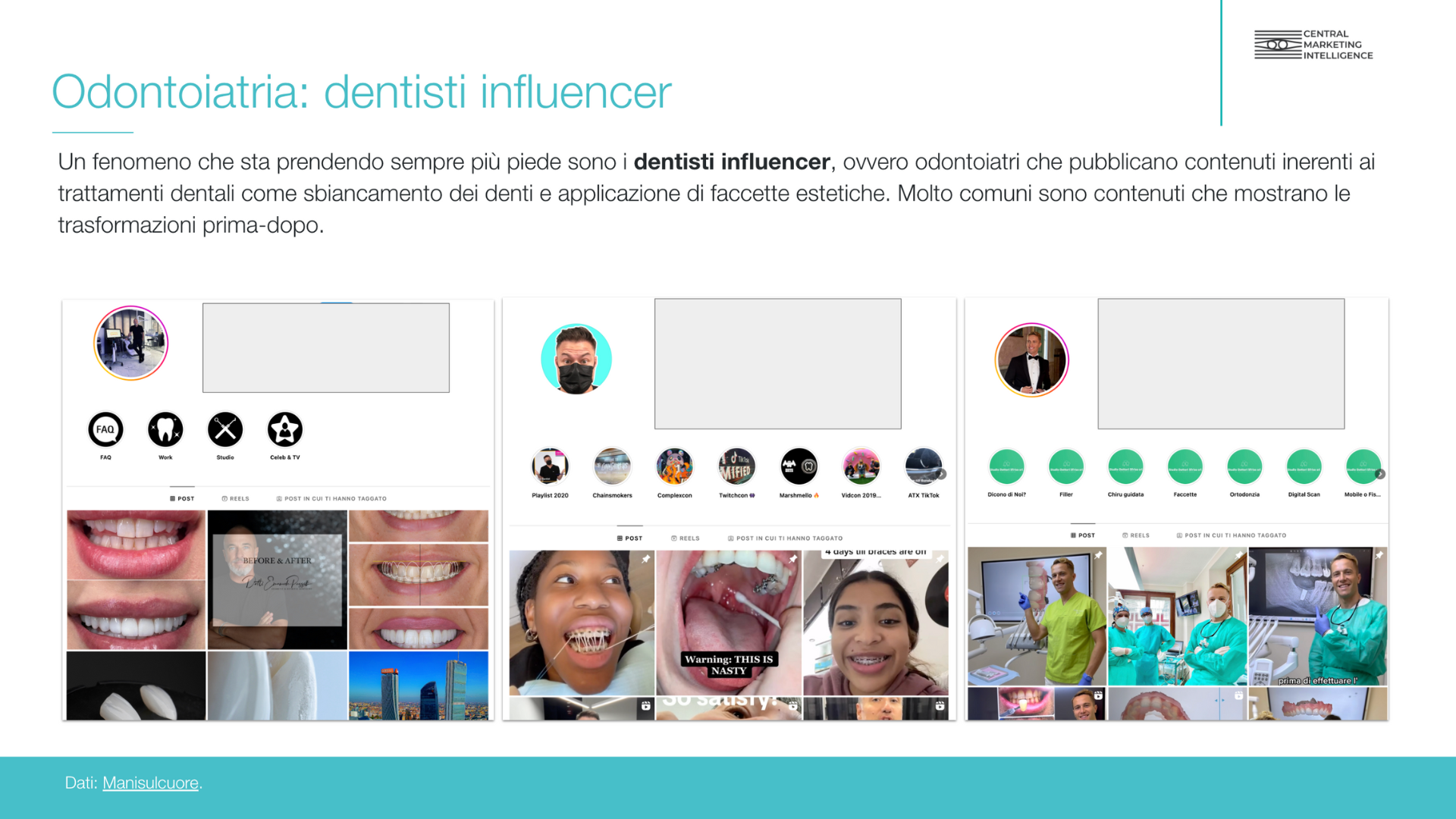 - Definizione del target e potenziali collaborazioni. Sulla base di queste informazioni, abbiamo delineato le principali buyer personas interessate ai servizi odontoiatrici, individuando le loro esigenze, comportamenti digitali e canali preferenziali per la ricerca di uno studio dentistico. Parallelamente, abbiamo individuato altri professionisti sanitari presenti nel territorio in cui opera lo studio con cui attivare potenziali collaborazioni mirate per offrire un percorso completo a 360° e ampliare il bacino di clienti.