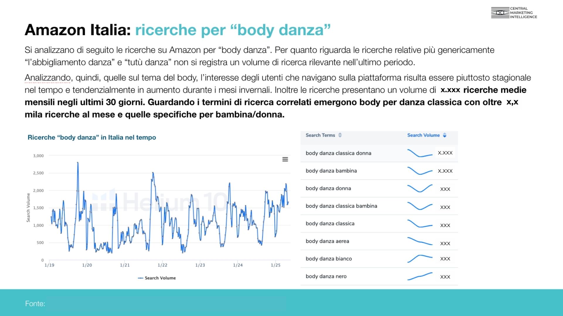 - Successivamente, l’attività si è concentrata sullo studio dell’interesse online, analizzando le ricerche effettuate dagli utenti e le dinamiche stagionali della domanda. Questo passaggio ha permesso di individuare le categorie di prodotto più richieste, come i body professionali, gli abiti da spettacolo e accessori per saggi, e di identificare i periodi dell’anno caratterizzati da stagionalità con picchi di interesse maggiori. Le keyword mappate sono state fondamentali per pianificare campagne di comunicazione e promozioni mirate, ottimizzate poi anche nelle fasi successive dello studio.