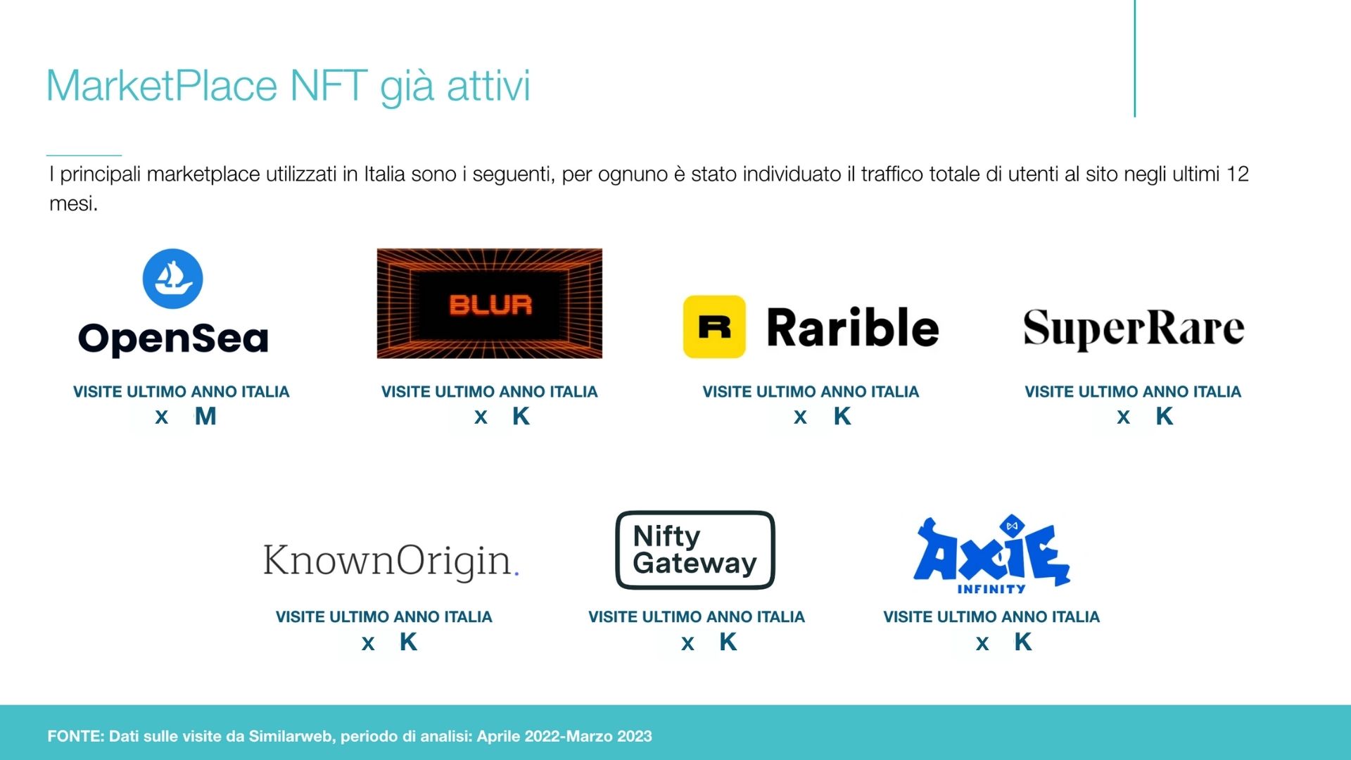 Abbiamo quindi realizzato una consulenza strategia basata sui dati che fornisse le informazioni rilevanti per migliorare e concretizzare il Business Plan della cliente. Inoltre, si intendeva valutare le dimensioni effettive del mercato degli NFT al fine di coglierne le reali opportunità, soprattutto in relazione al campo della moda e degli accessori.