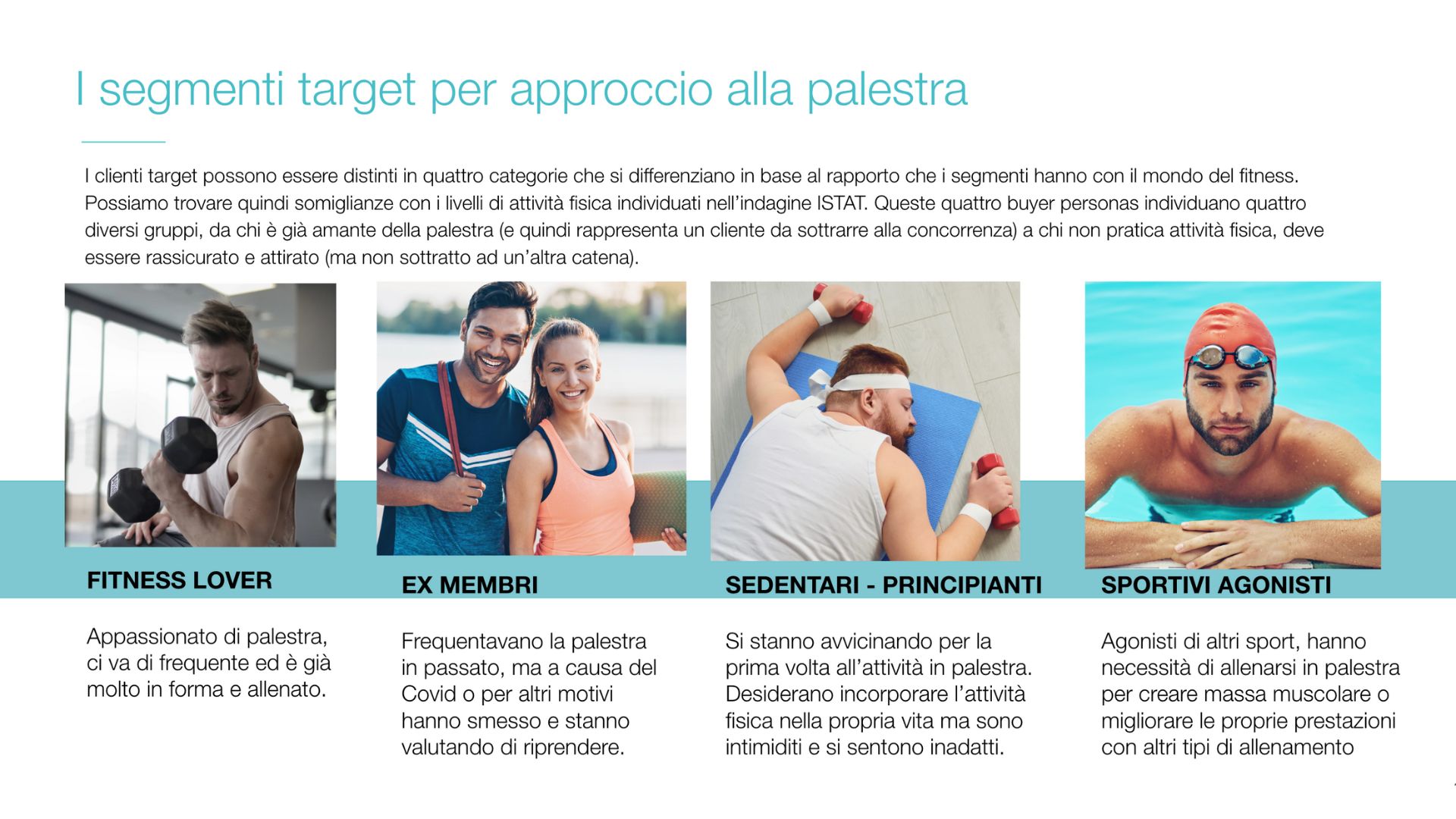 - Definiti gli sport più in voga all’interno dei centri fitness, si è passati alla valutazione del livello di interesse di ciascuna attività e la definizione del target di riferimento locale. A ciascuna attività sportiva è stata quindi assegnata una diversa buyer personas, con determinate caratteristiche ed esigenze.