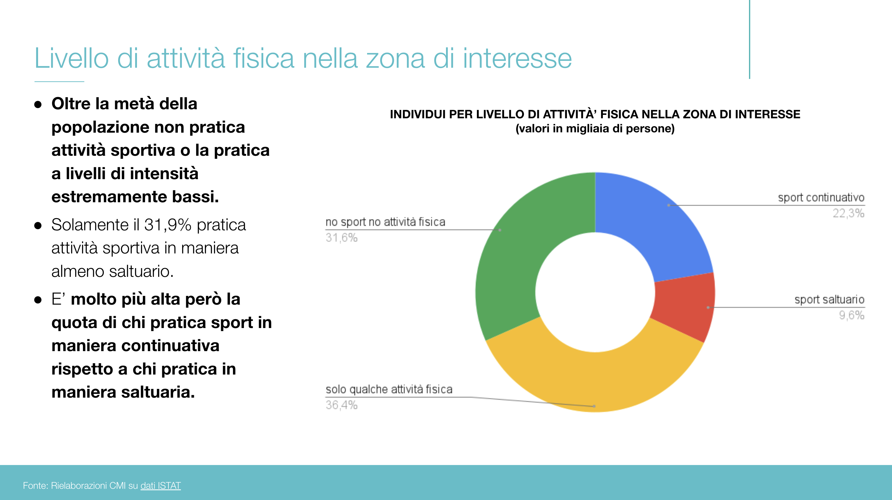- L’analisi del contesto di mercato per esaminare i dati relativi all’interesse delle persone in Italia per l’attività fisica. In questa area abbiamo inoltre approfondito le fasce di reddito delle persone nella zona geografica di interesse per supportare le valutazioni successive in merito al potenziale dei vari servizi fitness premium suggeriti.