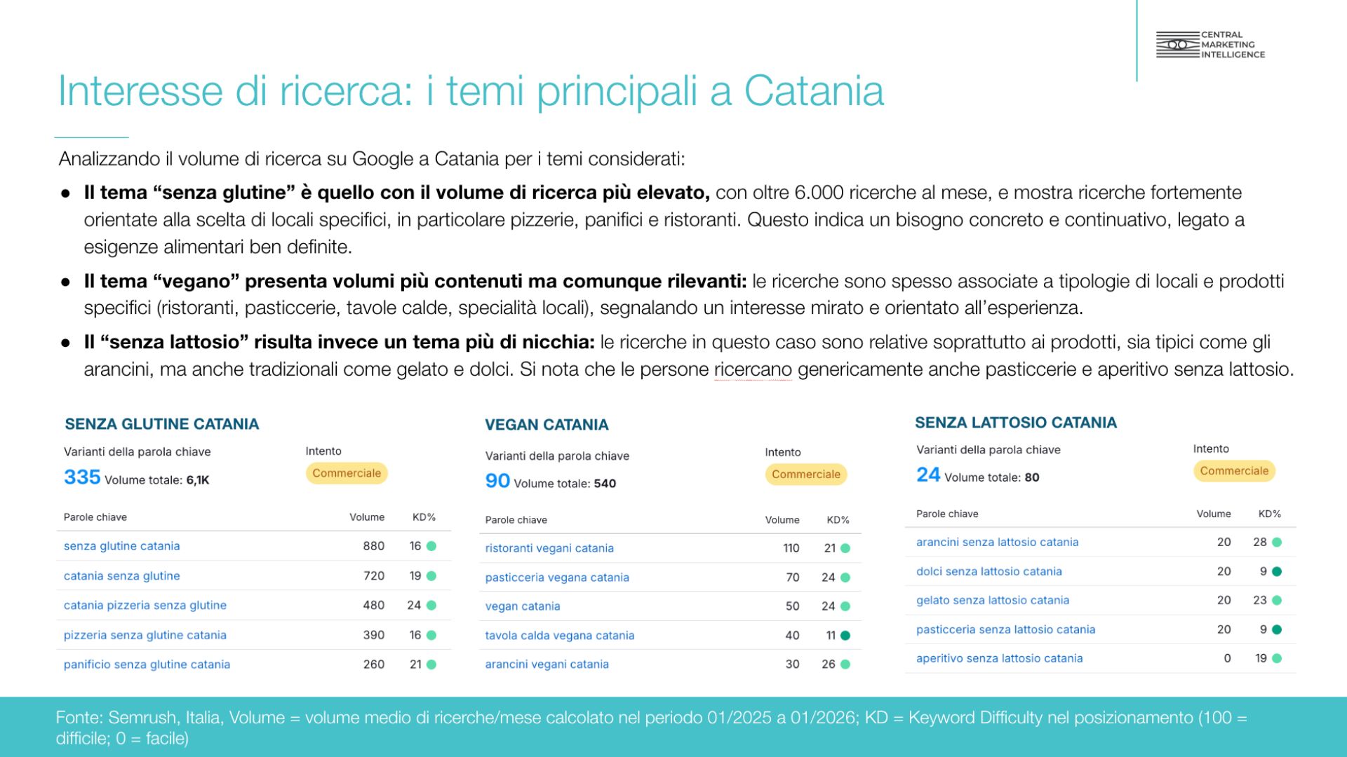 La seconda fase ha analizzato come e quanto gli utenti cercano online i servizi offerti da Verso Coffice, sia in ottica B2C (chi cerca un locale per consumare) sia in ottica B2B (chi cerca un laboratorio o un fornitore per la produzione in conto terzi). L’analisi ha permesso di mappare le principali query di ricerca legate alla caffetteria specialty coffee, ai prodotti senza lattosio e alle proposte vegane a Catania, evidenziando opportunità specifiche di intercettazione della domanda tramite SEO e advertising locale.
