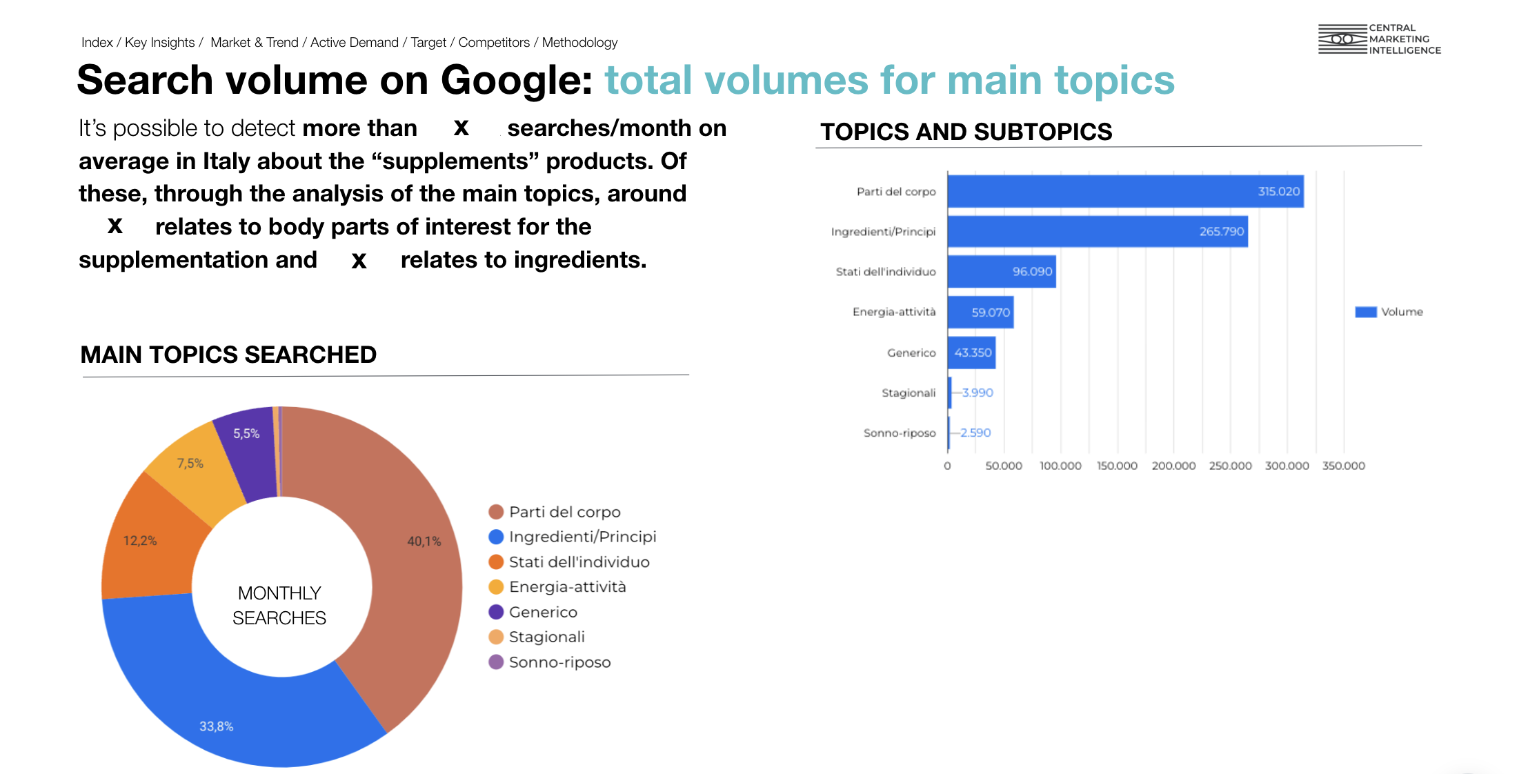 - Quanto è attiva la domanda online relativa agli integratori alimentari, così da identificare il potenziale interesse dei clienti target. Per farlo abbiamo intercettato le ricerche su Google, ma anche sui principali marketplace come Amazon, per approfondire anche i canali online su cui gli utenti effettuano gli acquisti.