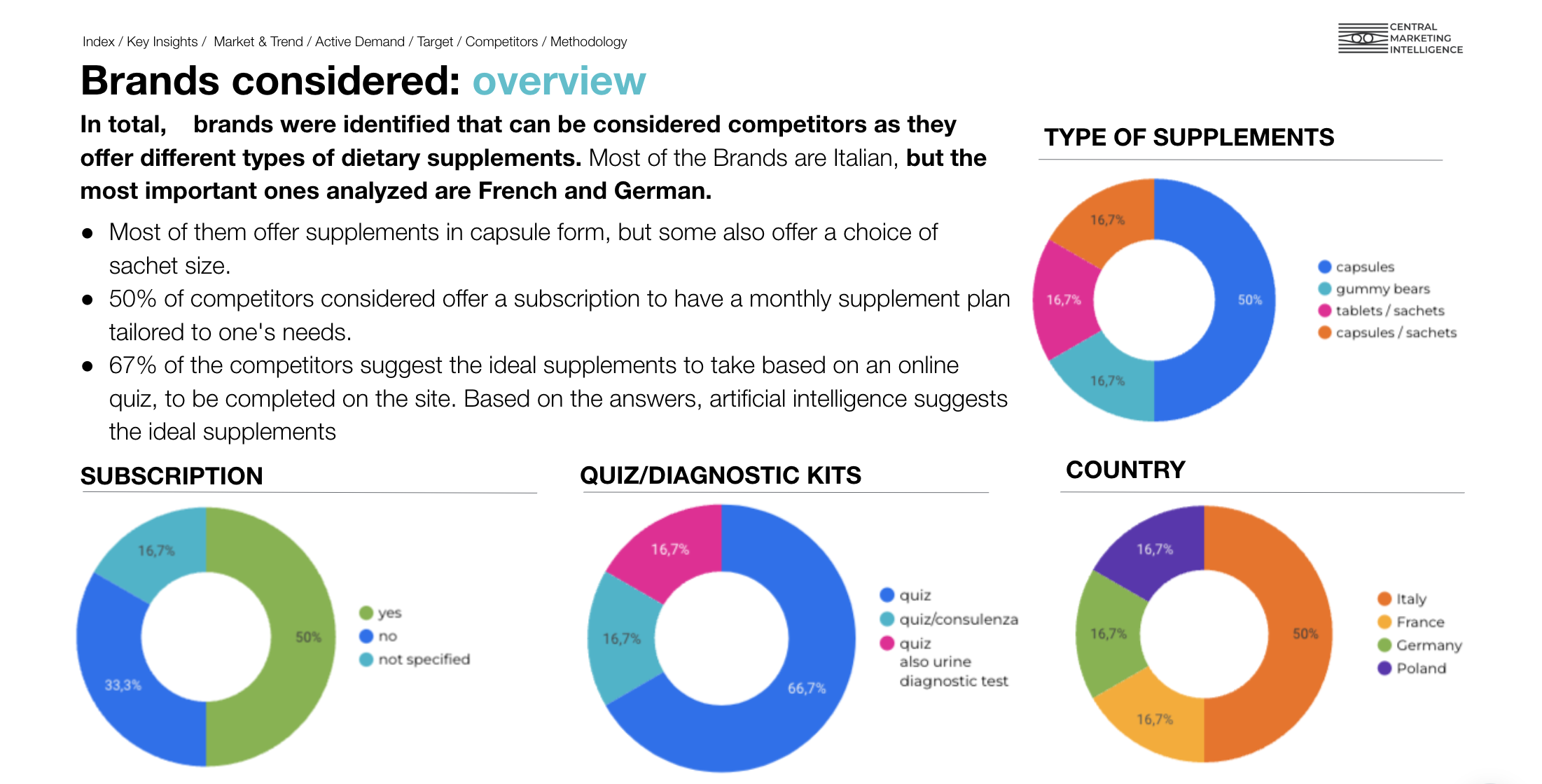 - Infine, abbiamo identificato quali sono le altre aziende del settore che stanno attualmente proponendo integratori alimentari. Lo studio ha portato alla luce un contesto competitivo particolarmente variegato, in cui sono presenti numerose aziende e startup offrono molteplici varianti di integratori che lanciano sul mercato con strategie di marketing ben strutturate.