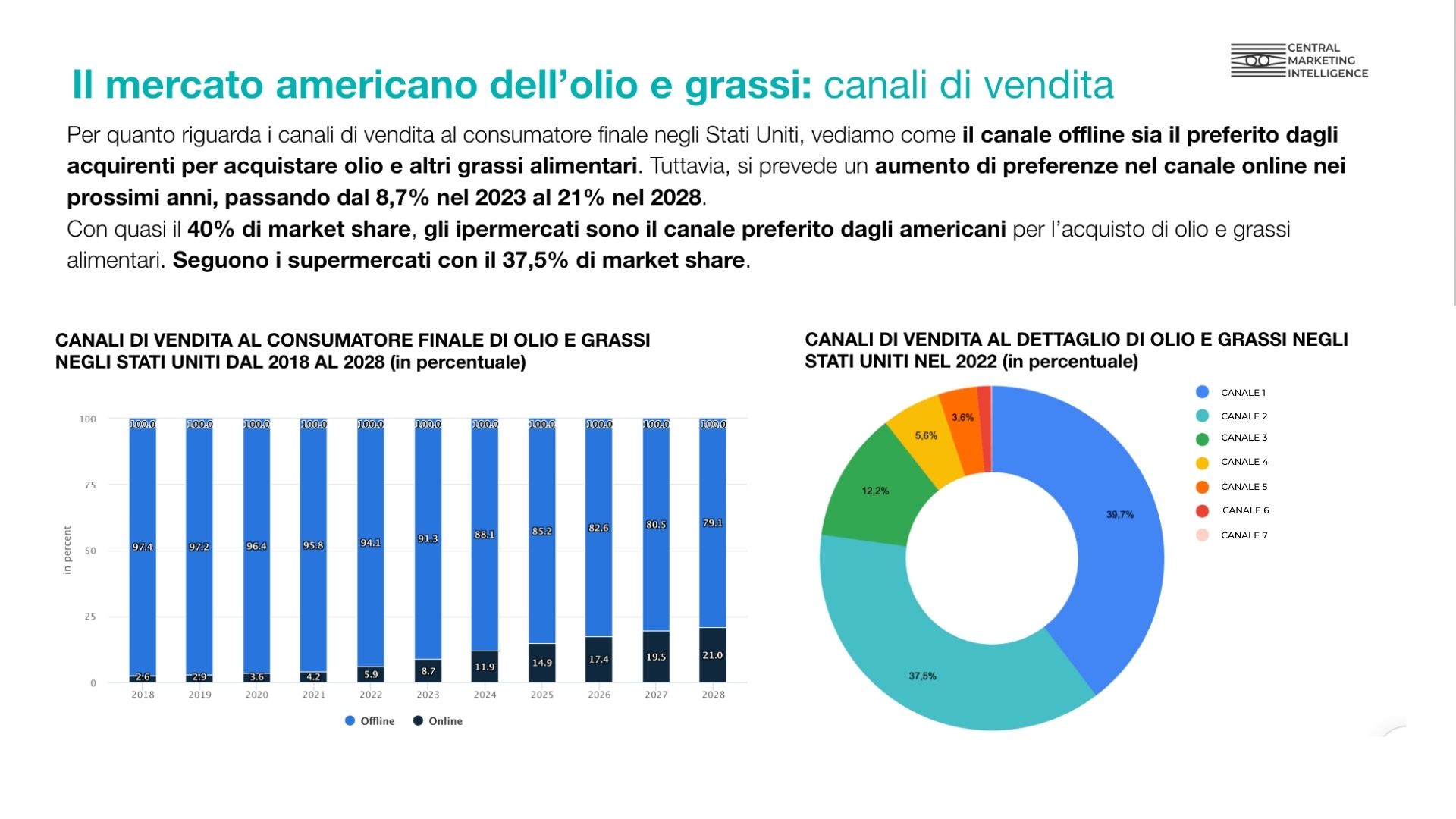 - Abbiamo innanzitutto analizzato il mercato dell’olio extravergine d’oliva negli USA, definendo volumi dimensionali e trend di crescita dei diversi segmenti.