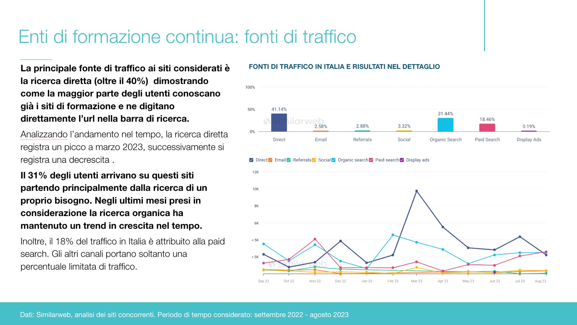 - Lo studio della concorrenza, identificando e selezionando i principali player del settore. Abbiamo quindi esaminato i concorrenti che forniscono formazione sulla sicurezza, includendo sia i provider locali che nazionali, con una particolare attenzione all’approfondimento delle piattaforme online. Ne abbiamo analizzato le strategie di marketing e di comunicazione, focalizzandoci anche sull’individuazione dei livelli di investimenti pubblicitari online e offline al fine di scoprire aree di differenziazione.
