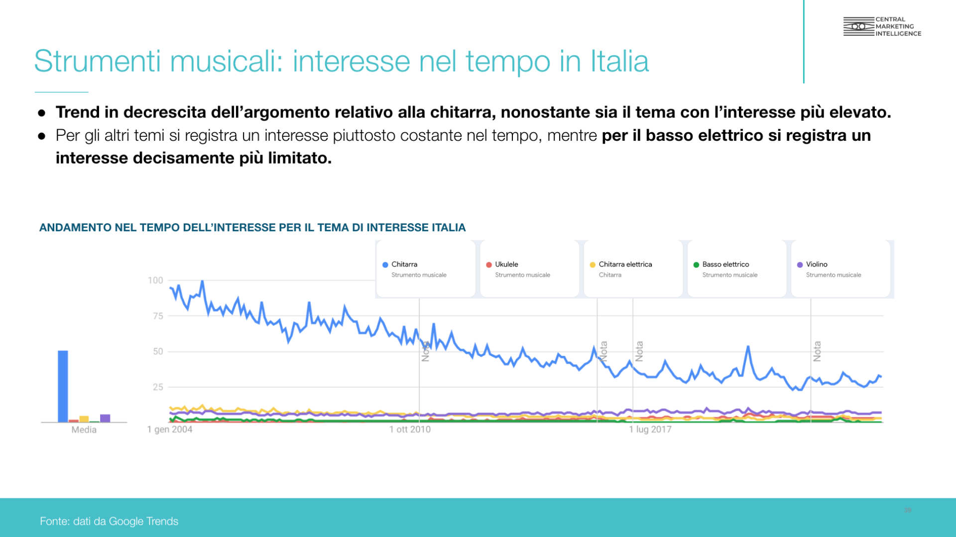 - Individuati quindi i dati chiave di contesto, siamo passati all’analisi della domanda attiva, per comprendere l’interesse per le applicazioni di musica. Sono stati quindi studiati i volumi di ricerca su Google relativi all’apprendimento dei vari strumenti musicali ed alle app di supporto correlate.