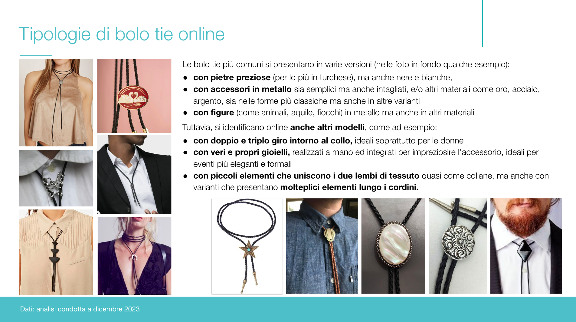 Un team di imprenditori ci ha contattati per richiedere un’analisi di mercato sugli accessori di lusso. In particolare, i giovani ragazzi avevano identificato un’opportunità unica nel settore di interesse e desideravano rivoluzionare il tradizionale concetto di bolo tie, o cravatta texana, attraverso l’introduzione di materiali preziosi e design innovativi.