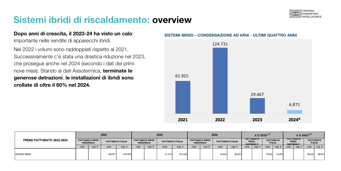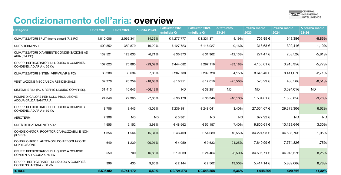 L’analisi ha permesso all’azienda di ottenere una visione chiara e aggiornata del proprio mercato di riferimento, identificando quali soluzioni HVAC presentano le prospettive di crescita più solide nel breve e medio termine. I climatizzatori split mostrano una crescita del +14,33% in volume nel 2024, le caldaie murali a condensazione classe A registrano un incremento del +2% con picchi significativi nei mesi autunnali, mentre i sistemi ibridi segnano un forte calo (-66%) segnalando un mercato in rapida trasformazione.