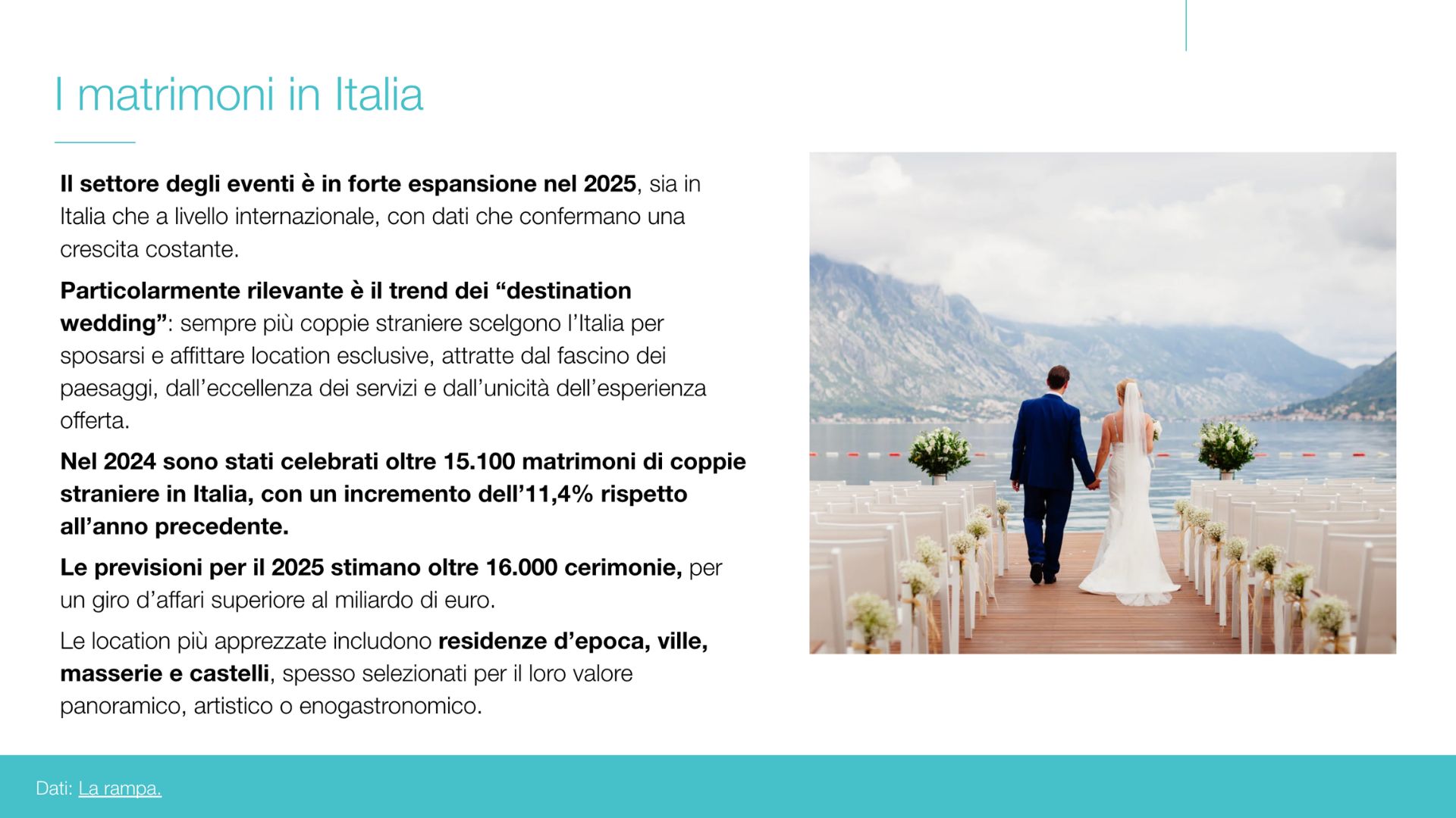 Il turismo di lusso in Italia genera il 25% della spesa turistica totale. Firenze è tra le destinazioni leader a livello nazionale: oltre un milione di arrivi nelle strutture ricettive. La domanda si caratterizza per una ricerca sempre più intensa di esperienze esclusive e su misura, alimentata da turisti internazionali provenienti soprattutto da Stati Uniti, Regno Unito e Germania. Il Centro Italia è la macro-area più richiesta per i matrimoni stranieri, confermando la Toscana come polo d’attrazione irrinunciabile per l’alto di gamma.