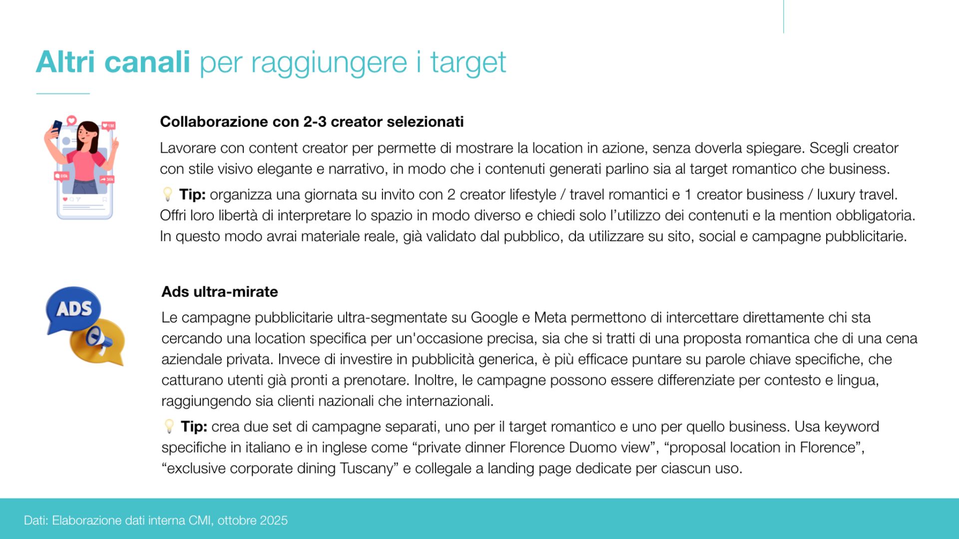 Abbiamo analizzato e aggregato i principali canali potenzialmente utili per raggiungere in modo più efficace i diversi segmenti target. Per il segmento romantico e wedding, abbiamo approfondito piattaforme, siti web e touchpoint digitali utilizzati da coppie, wedding planner e professionisti del settore per cercare location ed esperienze esclusive. Per il target business, invece, abbiamo analizzato le modalità con cui aziende, brand e professionisti si informano e selezionano spazi in linea con le proprie esigenze: eventi privati, incontri riservati, shooting, presentazioni e attività di rappresentanza. A partire da questa mappatura, abbiamo poi prioritizzato i canali più rilevanti per ciascuna buyer persona, distinguendo quelli più adatti alla generazione di visibilità, alla creazione di partnership e alla conversione commerciale.
