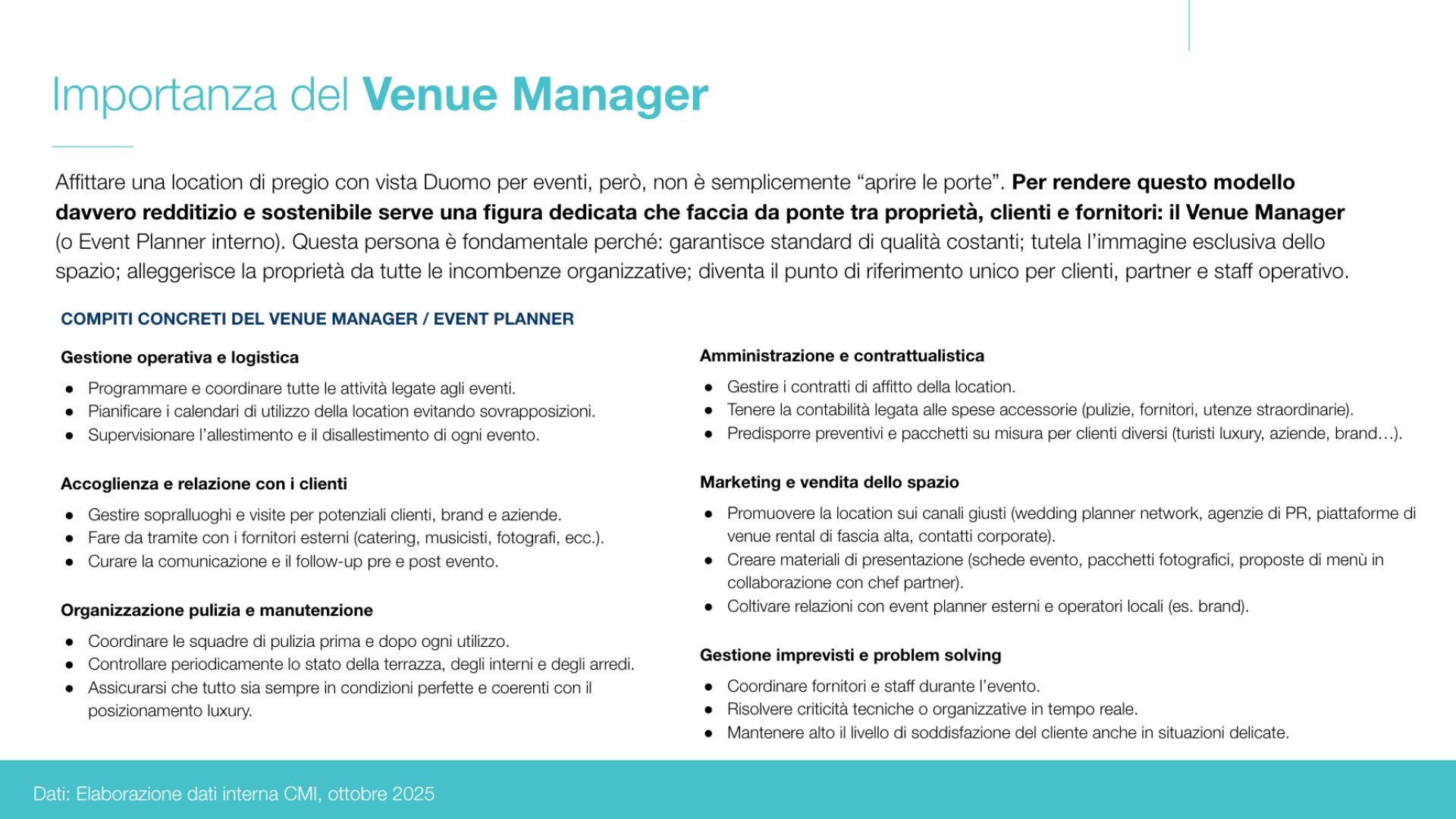 Dal punto di vista operativo, l’analisi ha evidenziato l’importanza di una figura dedicata alla gestione della location, responsabile del coordinamento degli eventi, dei rapporti con i fornitori, della commercializzazione e del mantenimento degli standard qualitativi. Sono state inoltre individuate alcune aree da presidiare con attenzione nella fase di avvio, tra cui autorizzazioni, accordi condominiali, coperture assicurative e procedure di gestione degli eventi. Questo ha permesso di trasformare l’idea iniziale in un modello più strutturato, realistico e sostenibile nel tempo.