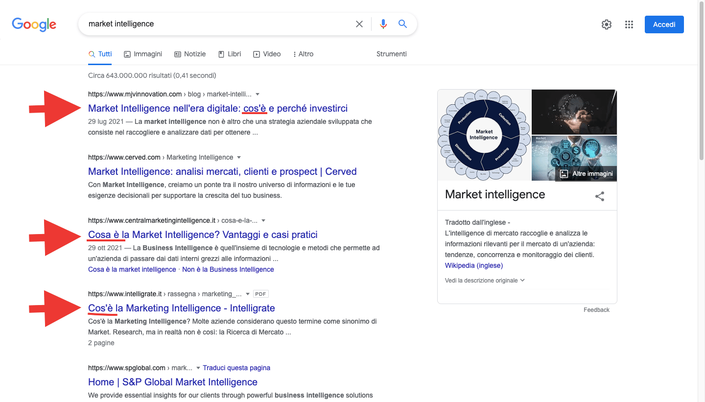 Come puoi vedere nell’immagine qui in basso, se digiti nella barra di ricerca “Market Intelligence” tra i primi quattro risultati, almeno tre si focalizzano sul rispondere proprio a questa domanda.